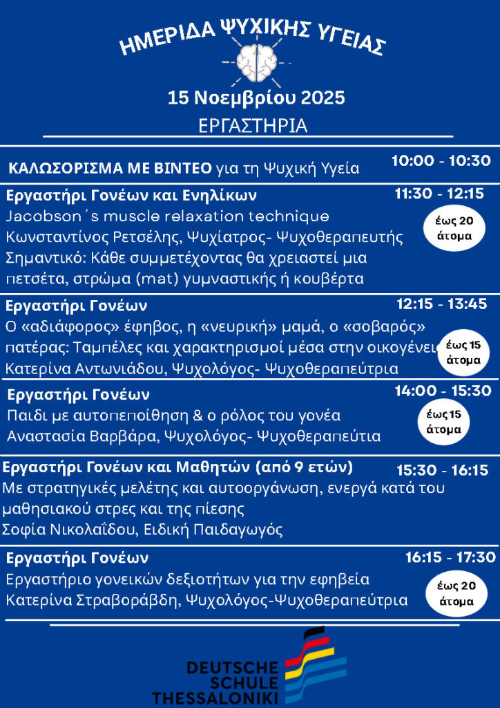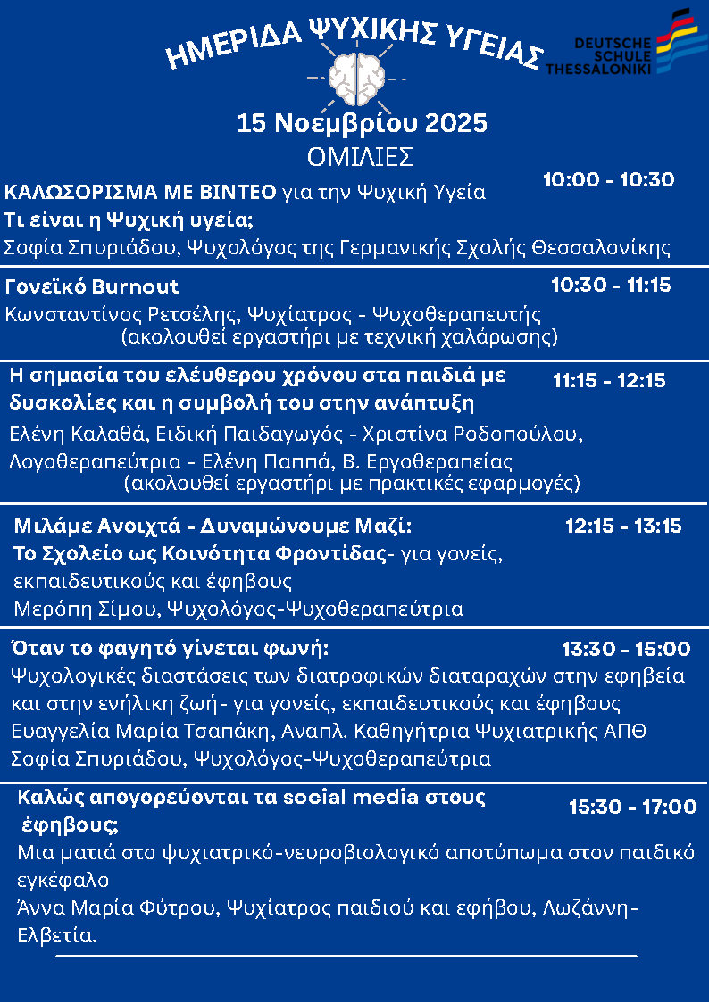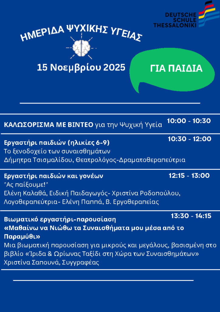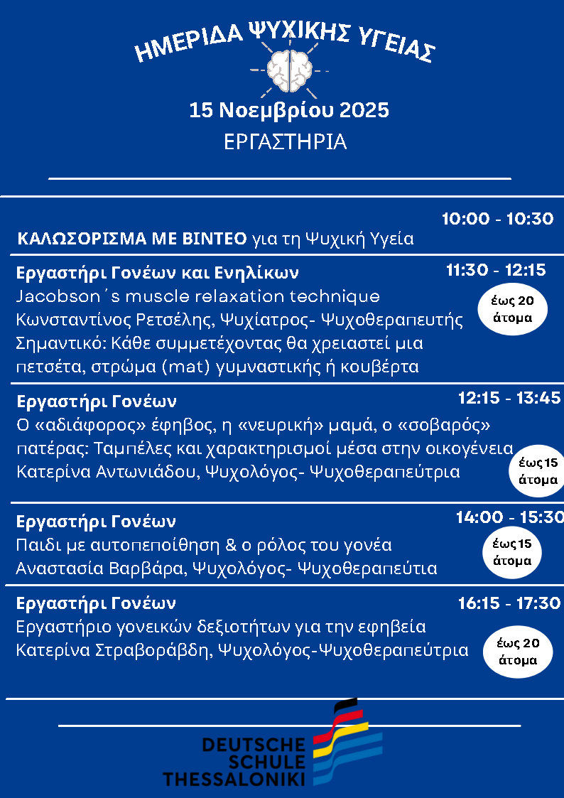 Η Γερμανική Σχολή Θεσσαλονίκης σας προσκαλεί θερμά στην Ημέρα Ψυχικής Υγείας 2025, που θα πραγματοποιηθεί το Σάββατο 15 Νοεμβρίου 2025, από τις 10:00 έως τις 18:00, στις εγκαταστάσεις της Σχολής. Η εκδήλωση είναι αφιερωμένη στην προώθηση της ψυχικής υγείας, της αυτοφροντίδας και της εσωτερικής ενδυνάμωσης.