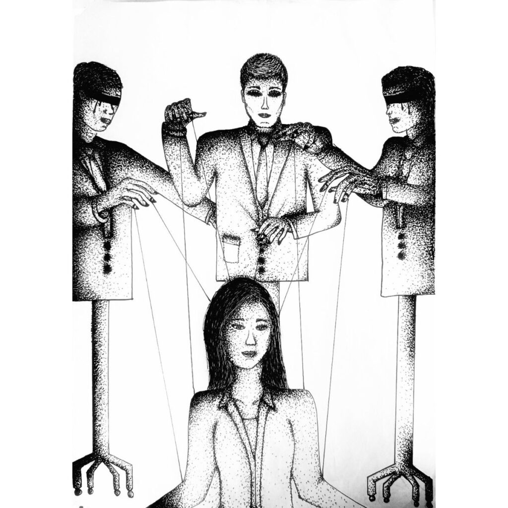 Η Δέσποινα διερεύνησε το θέμα της ελευθερίας της σκέψης και του κινδύνου χειραγώγησής της. Το έργο της, μια εκφραστική ασπρόμαυρη σύνθεση, βασίζεται σε ένα πορτρέτο που δημιουργήθηκε με τη βοήθεια τεχνητής νοημοσύνης, συνδυάζοντας σύγχρονη τεχνολογία και καλλιτεχνικό προβληματισμό.