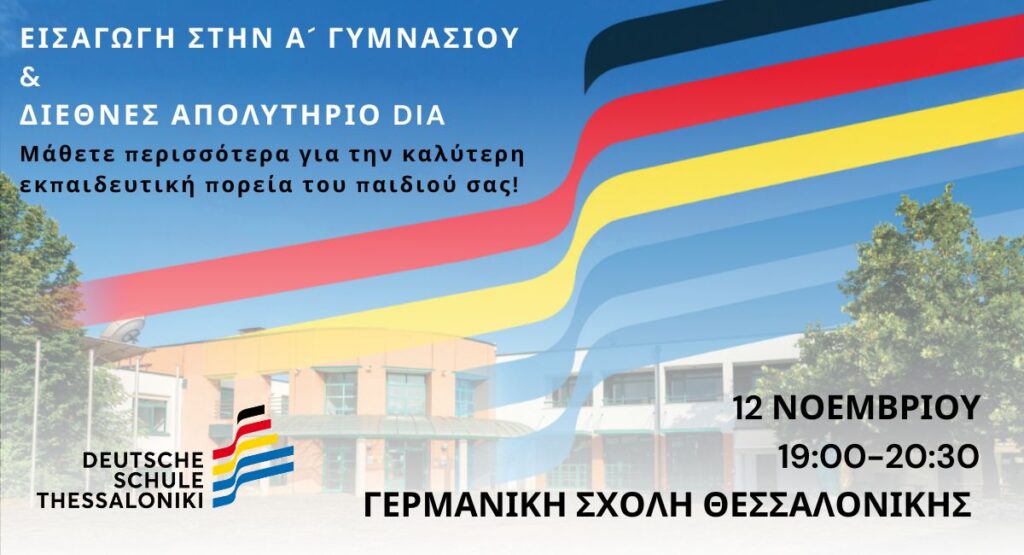 Ελάτε να ενημερωθείτε για τα προπαρασκευαστικά μαθήματα της 5ης και 6ης τάξης, για την εισαγωγή στο Γυμνάσιο της Γερμανικής Σχολής Θεσσαλονίκης και για το Διεθνές Απολυτήριο (DIA).